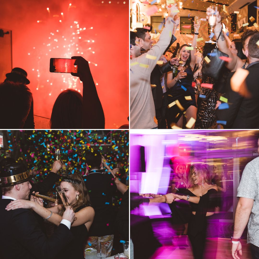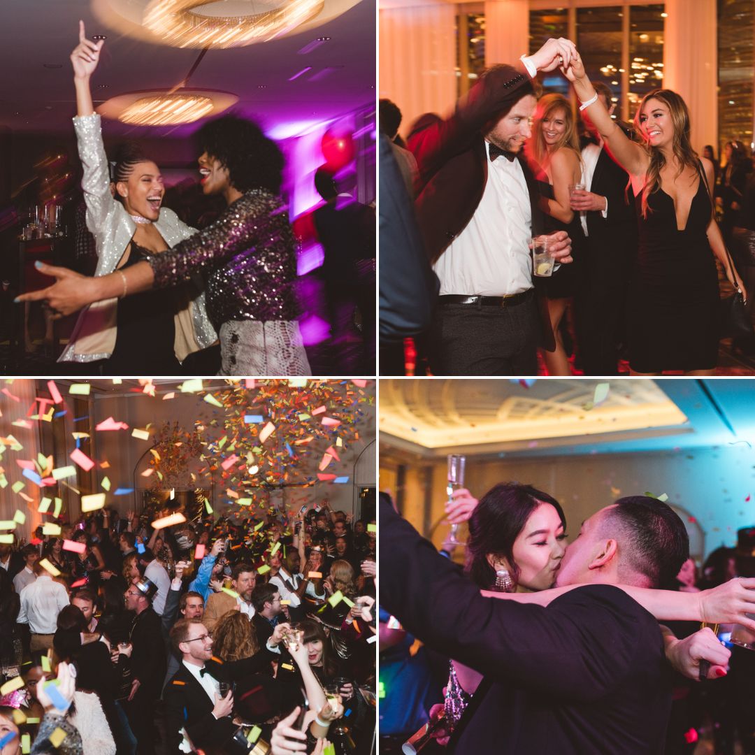 Prefer glamour closer to ground level? Head to our third floor Grand Ballroom, where the vibe is all elegance and energy. Guests enjoy a 4-hour open bar, a lavish hors d’oeuvres buffet, a live DJ set, and midnight bites to keep the party going. The ballroom features floor to ceiling windows with sweeping views of the city. A champagne toast at midnight and a photo booth for memories add to the fun!