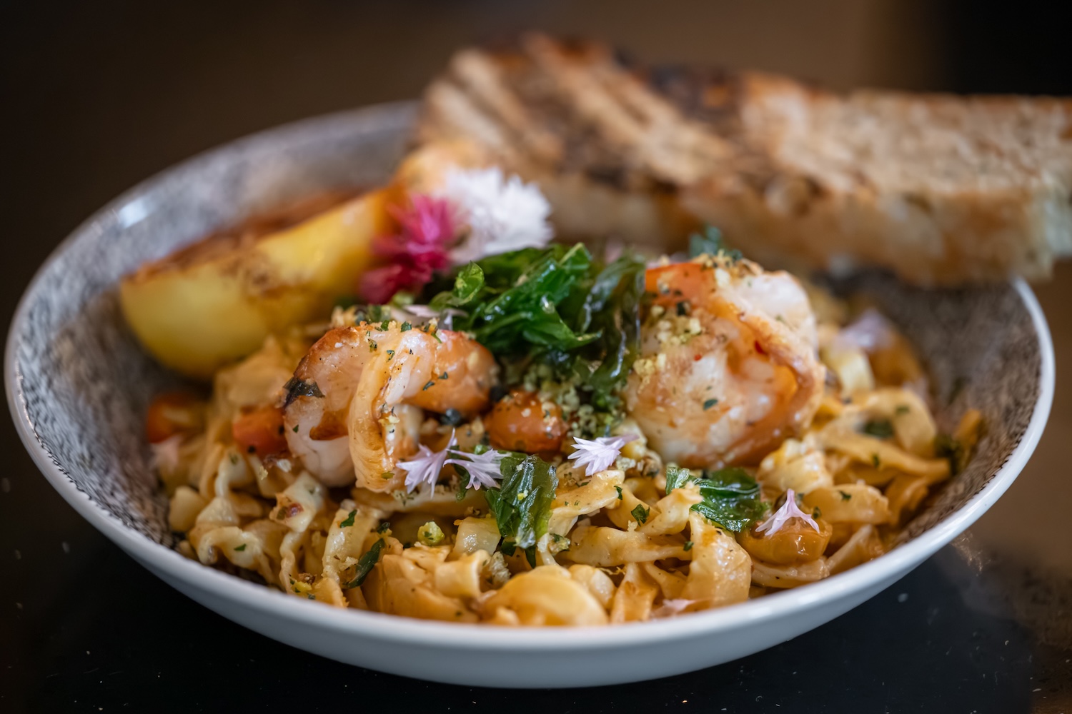 Housemade fettuccine tossed with sautéed shrimp, heirloom and cherry tomatoes, spinach, Calabrian chile butter, and a pistachio crumb.