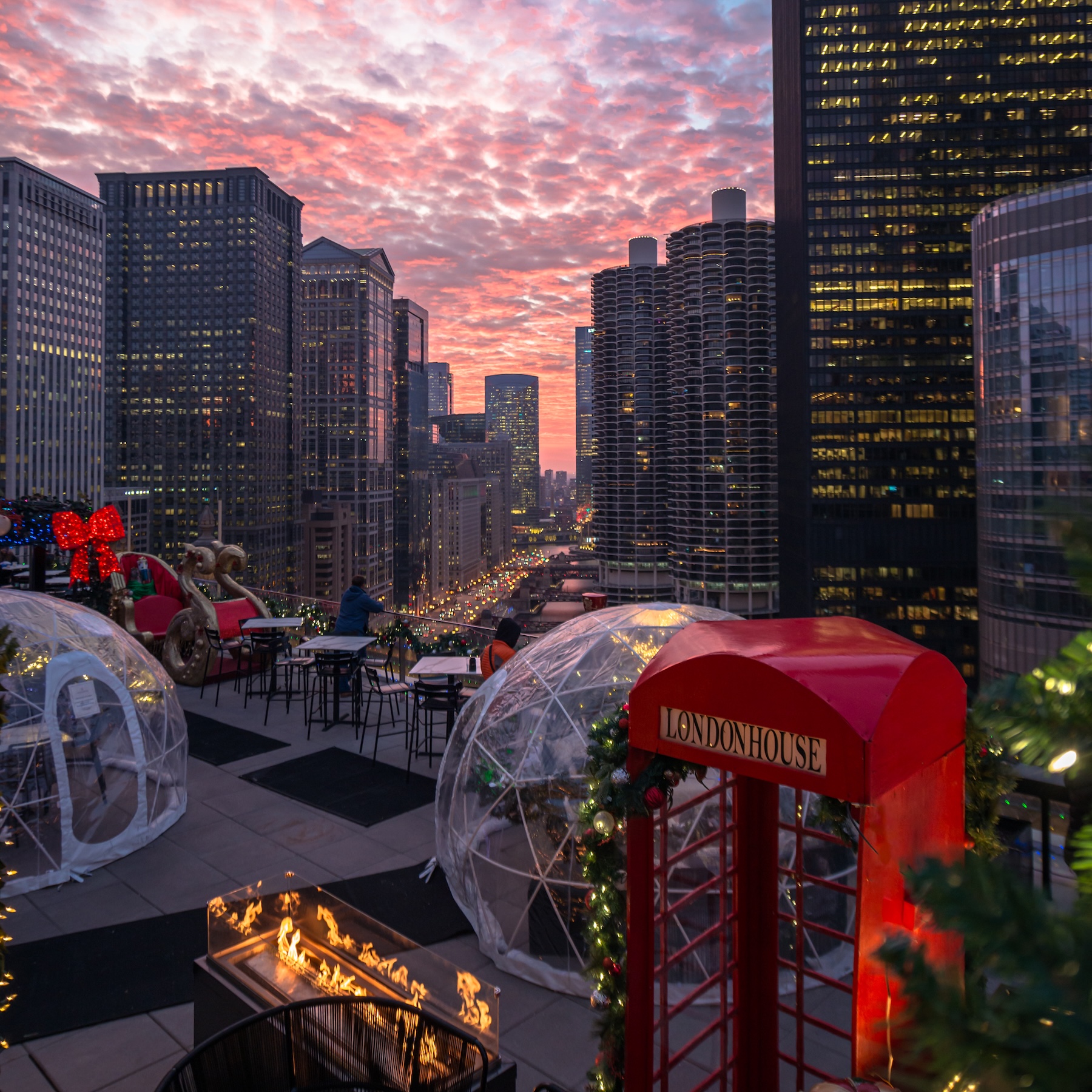Perched above the Chicago River, LH Rooftop’s Rudolph’s Rooftop Winter Igloos offer a private, heated escape with panoramic views of the skyline and the city’s seasonal sparkle. Igloos feature a special menu designed for groups and sharing.