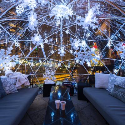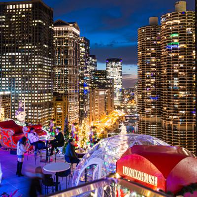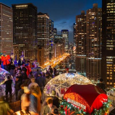 Perched above the Chicago River, LH Rooftop’s Rudolph’s Rooftop Winter Igloos offer a private, heated escape with panoramic views of the skyline and the city’s seasonal sparkle. Igloos feature a special menu designed for groups and sharing.